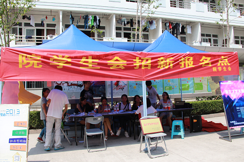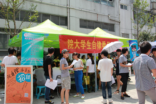 每一年新生入学后,学院团学组织部门都会把招新工作看成了重点“突破口”,他们希望通过招新,能把有能力的“新鲜血液”补充到团学组织中,把部门工作一级级地往下传。他们摆开的架势、认真劲一点也不亚于企业招聘者。各学生组织在现场分别设置了展示组织主要职能及成果风采的展板及喷绘、海报等,使新生对此有多方位的认识。同时,各学生组织在指挥部广播自己的招新通告和宣传口号调动了全场的热烈气氛,艺术类组织更纷纷进行现场表演,吸引了大批同学驻足欣赏。在众多的应聘者中,他们还要进行严格的考核、筛选。而竞聘者更是希望在竞争中脱颖而出,借机锻炼能力。有的同学早已“心有所属”,就直奔自己心仪的部门,询问基本情况,领取并填写了报名表;有的同学还在对加入哪个部门犹豫不决,因此特意来听各部门的情况介绍,或当场决定加入某部门,或仍然在考虑中;有的同学则是偶然路过,听说这里招新,就进来看看,结果不少人也领了报名表。
