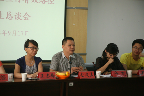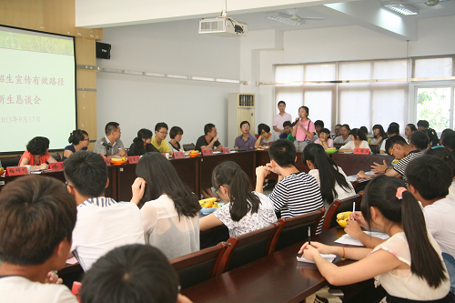 9月17日下午,学院在正德楼招聘大厅召开2013年招生宣传有效路径新生恳谈会,就2013年招生宣传有效性事宜听取新生意见。学院副院长王志梅、招生就业处副处长金建孟、各系学工办主任、辅导员老师以及各系新生代表(温州地区)100余人参加了本次恳谈会。会议由招生就业处副处长金建孟主持。