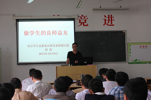 两位专业教师结合实际工作上台现身说法。陈崇炯老师结合今年的暑期社会实践谈师德实践,陈老师说:暑期社会实践最能体现老师的敬业爱生精神;为了指导好学生的专业实践,必须要处处为学生考虑,时时为企业着想;作为指导老师,不但要指导好学生的专业技术,还要关心学生的生活;暑期社会实践是一个系统工程,要从多个方面去思考,既要组织好、指导好,也要宣传好,从这个角度说,暑期社会实践活动也是指导教师的具体指导实践过程。一套完备的工作思路与计划,严格制度、组织和管理,注重舆论影响是成功带队的三件“法宝”;胡新老师结合多年担任班主任的经历,谈如何既要深刻了解高职学生特点,因材施教,又要深入谈话谈心,循循善诱,刚柔并济。加强三个课堂和公寓方面的纪律管理,严把请假关口,以纪律为抓手推进班风学风建设。将学生思政工作中的管理、教育、服务三位融为一体,在日常实践中进行师德建设。