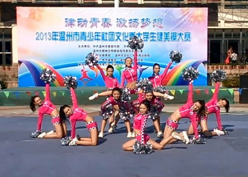 她们是一群聪明可爱的90后女孩,活泼好动,因共同的兴趣而联系啦啦操,并组建了财会系啦啦操队;她们力争上游,为获得优异成绩而不辞劳苦,辛勤训练:清晨早早起来、午间放弃休息、晚上训练到十点钟;晴天的户外,雨天的室内,都能看到她们训练的身影。这一切的努力终究使她们在学院体育文化节斩获亚军,为财会系争得了荣耀,并代表学院参加2013年温州市青少年社团文化暨大学生健美操大赛。