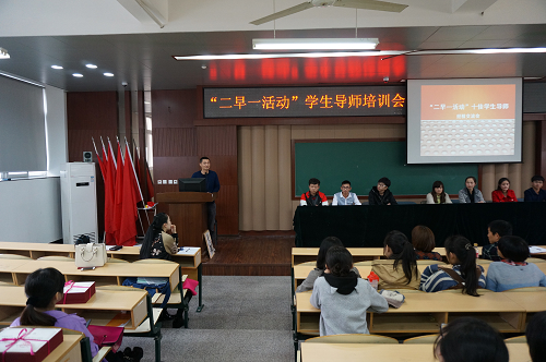 为进一步提升我院“二早一活动”学生导师的综合素质,表彰上学期表现突出的“二早一活动”十佳学生导师和先进个人。学生处于3月19日下午在崇学楼101室举行了“二早一活动”学生导师培训会暨十佳学生导师、先进个人表彰大会。学生处处长、团委书记叶吉波,各系学工办主任、相关辅导员出席,全院近200名学生导师参加,会议由学生处副处长吴冰主持。