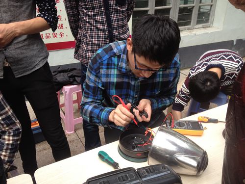 中午志愿者一来到社区,经过社区广播,活动很快有序的开展起来。志愿者们细心地布置好家电维修现场,对拿来的家电进行了详细的登记,志愿者对家电依次编号,并详细的记录每一件家电主人的姓名、联系方式、送来的时间等,志愿者们按序号系统化、区域化、流程化有责任地修理。在活动现场,志愿者们认真地为市民维修家电,积极与市民探讨家电使用过程中可能出现的问题,向市民们提供了很多家电保养的建议。对于在修理电器中遇到不太明的问题时,志愿者们相互交流,相互合作,共同完成。遇到无法修理的电器,他们还是义不容辞的利用自己的专业知识进行深入地专研。在整个过程中,时常遇到一些问题,志愿者们并未因此而对手中的工作有了懈怠,他们工作时不喊苦,不说累,用心专研。最后,保质保量地完成了对洪殿社区义务家电维修的活动,并且赢得了社区居民的普遍赞许。