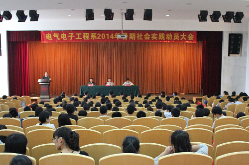 为积极响应关于组织开展2014年学院“三进一留”大学生暑期社会实践活动的通知,5月26日中午,电气电子工程系在树人堂隆重召开2014年大学生暑期社会实践活动动员大会暨安全文明教育。系党总支书记晁拥军、系主任苏绍兴、系副主任章丽芙,大二全体学生,大一各班班委共500余人参加本次大会。