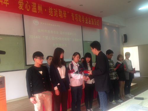 11月14日下午,温州市慈善总会、温州烟草公司2014年“爱心温州 结对助学”专项助学金发放仪式在浙江东方职业学院报告厅举行。温州市慈善总会副会长廖秀枢、温州市烟草公司办公室主任蔡群策、浙江东方职业学院领导出席会议。我院30名受助贫困学生参加了此次发放仪式,共获得资助15万元。