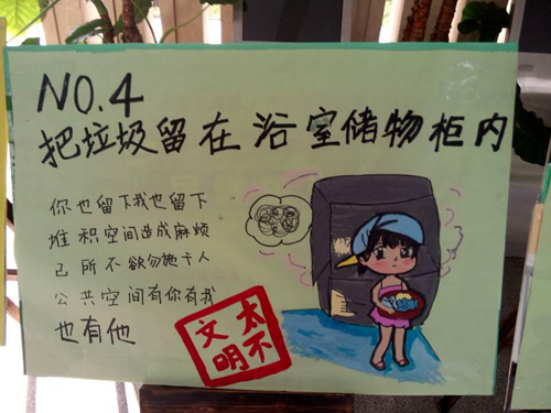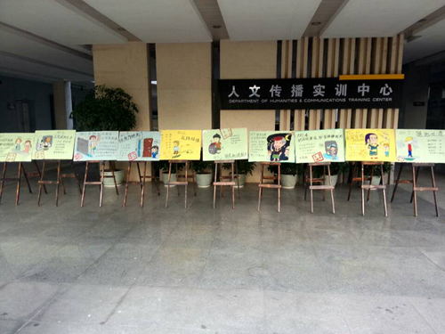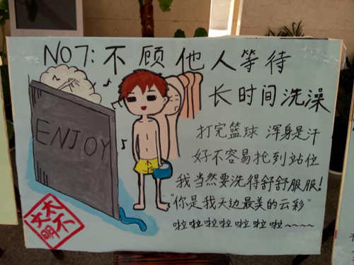 自11月26日起,在人文传播系一楼大厅展出漫画版“寝室十大不文明现象”,具体包括:一、漱口时不低头,溅到别人。二、洗衣机洗鞋子。三、上完厕所不冲。四、把垃圾留在浴室储物柜内。五、随地吐痰。六、乱扔垃圾。七、不顾他人等待,长时间洗澡。八、用力关门。九、寝室走廊大声喧哗讲电话。十、在寝室楼内吸烟。