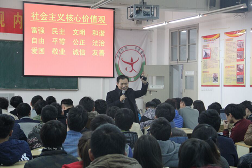 此次讲座是“社会主义核心价值观”教育系列活动课堂教学的第一讲。主讲人黄加銮书记从社会主义核心价值观的12个词语出发,深入浅出,引经据典,结合国情、社会现状为同学们解释了其内在的深刻内涵。同时,黄书记指出,作为温职学子,应该在勤学、修德、明辨、笃实上下功夫,下得苦功夫、求得真学问,加强道德修养、注重道德实践,善于明辨是非、善于决断选择,扎扎实实干事、踏踏实实做人,于实处用力,从知行合一上下功夫。黄书记对在座的学生干部也提出了要求,他希望全体学生干部不仅自己有把社会主义核心价值观学好,记在心中,更要做一名宣讲员,到群众中去,到同学中去,弘扬社会主义核心价值观,传播正能量。