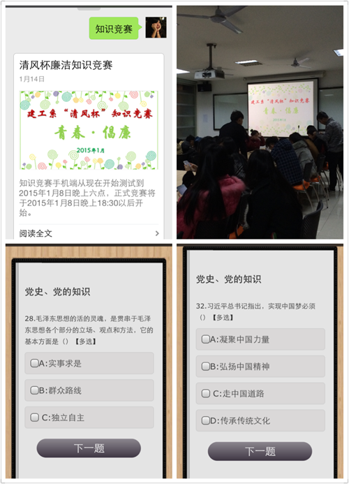 本次知识竞赛充分利用现在的新媒体工具,通过建工系公众微信平台推送题目,参赛的学生可以直接通过手机进行答题。新颖的竞赛方式,让每一位参赛同学都跃跃欲试。