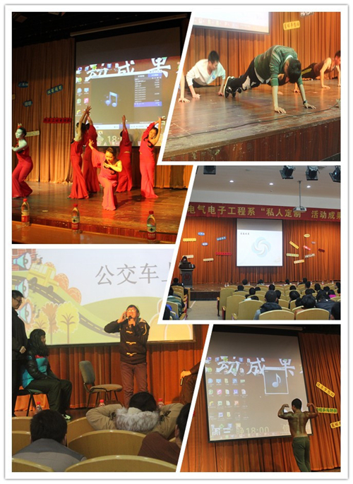 2015年1月8日,电气系 “私人定制”活动成果展在树人堂举行,到场的嘉宾有温职院学生处处长叶吉波老师、学生处副处长吴冰老师、电气系党总支书记晁拥军老师及电气系辅导员和班主任老师们,“私人定制”全体学员及导师、大一学生、大二班长团支书参加了活动。