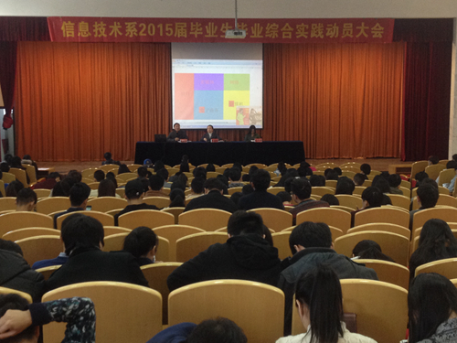 1月21日下午,信息技术系2015届毕业生毕业综合实践动员大会在树人堂举行,系主任田启明、系党总支书记童炳金、系副主任张燕姑、系实训科和系学工办负责人、各班班主任以及全体15届毕业生参加了此次动员大会,会议由系书记童炳金主持。