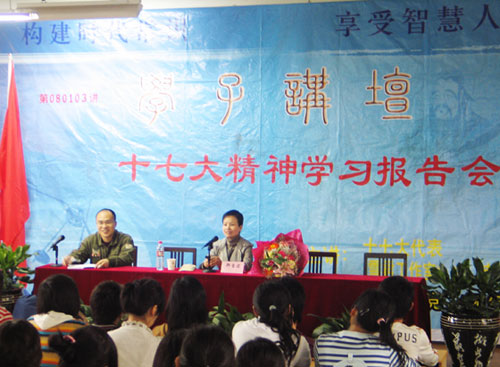 4月16日下午,受学院党委宣传部的邀请,中国共产党第十七次全国代表大会代表、温州晚报《雪君工作室》主持人郑雪君在工商系“学子讲坛”做《十七大精神报告》。学院党委委员、宣传部部长朱金荣老师出席报告会。工商系全体教工党员、学生党员、第十期党校培训班学员、学生干部、入党积极分子近300人听取了报告。