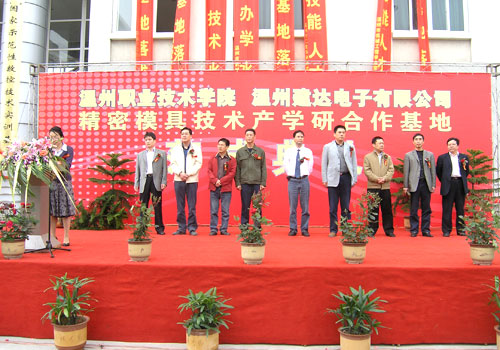 仪式由我院副院长王向红主持,我院丁金昌院长出席仪式并讲话。他指出,我院与建达公司的合作是我院大力推行“校企合作、工学结合”的重要举措,也为我院筹建的温州市模具重点实验室的研发工作提供了强大的后盾。据悉,我院与建达公司建立的精密模具技术产学研合作基地共投资1600万,占地1000多平方米。