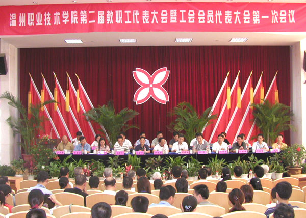 工会代主席倪集崇在会上作了《围绕中心、突出维护,为建设全国示范性高职院校而努力奋斗》的报告;夏晓军副院长作了《温州职业技术学院院系两级管理暂行办法》草案说明;计财处处长申屠新飞作了《温州职业技术学院2002至2003年度财务情况的报告》。会上,温州医学院党委副书记仇毅、市教育工会主席林晓新分别致贺词。