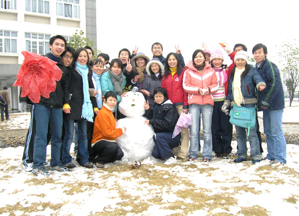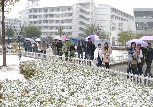 1月13日,当同学们从被窝里钻出来的时候,窗外是一个粉装玉砌的世界,美丽的大学城校园披上了一件银装。纷纷扬扬的雪让温职院校园到处洋溢着欢乐的气氛。同学们在欢乐中尽情展现出青春活力,打雪仗、堆雪人让稀罕雪的南方大学生尝了一回鲜,过了一把瘾。这一场2005年下的第一场雪却在温职院校园到处都透着“暖意”——