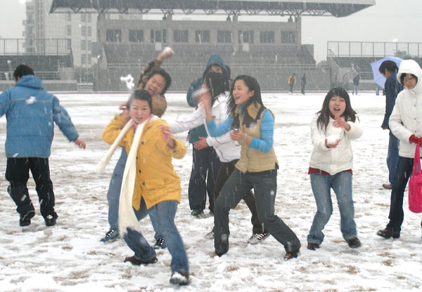 课间,同学们把青春挥洒在雪地里