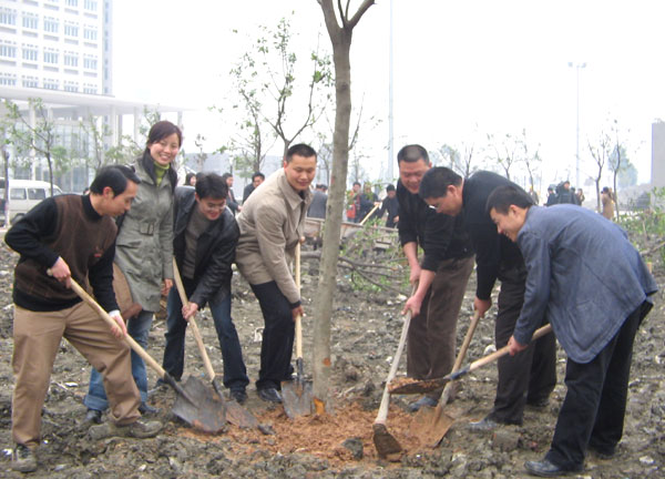 植树活动现场,我院领导、教师和自发组织的同学们持锄把锹,把一棵棵树苗安了“家”,落了“户”。教师们一改往日教室中的温文尔雅,个个捋肘卷裤,一字排开,推车挖泥,培土浇水;学生们也个个毫不示弱,干得十分迈力,劳动现场处处一派热火朝天,似乎在鸣奏一场“劳动演唱会”。在活动中,还不时地传出一阵阵成功的欢呼声。看着一棵棵拔地而起的小树苗,我院党委书记、院长周锦成的脸上也“飞”上了笑容,他情不自禁地说:“到2008年举行北京奥运会的时候,这片由师生们共同栽下的树木,将呈现出一个北京奥运会会标——中国印。”据悉,在栽树前,我院基建处已经对这片空地的种树位置做了规划,等绿色成荫的时候,俯视这片“奥运林”,将出现一个绿色的“中国印”。
