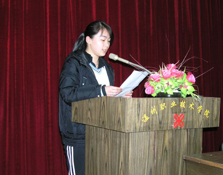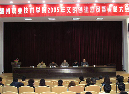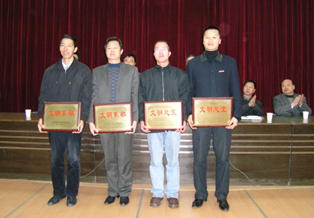 会上还表彰了我院2004年涌现出来的文明处室、文明系部和文明班级。人保处和学工部荣获得“文明处室”称号,人文系和机械系获得“文明系部”称号,营销0301班等33班级荣获文明班级称号。