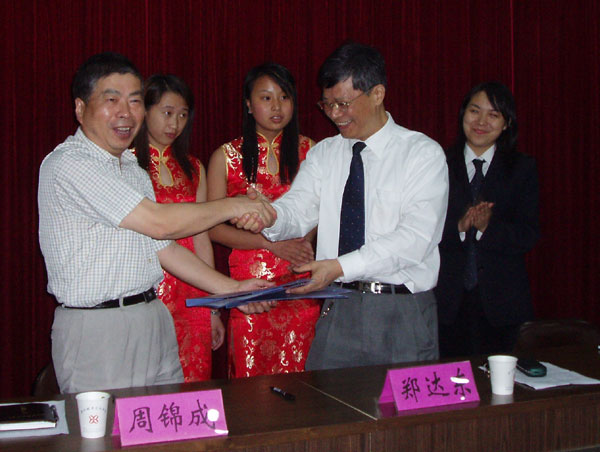 周锦成与德力西副总裁郑达东签约后亲切握手