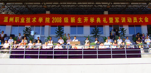 丁金昌院长在讲话中与新生们共同分享了学院的办学成果以及介绍了高职教育的办学特色。他说:“我与你们共自豪,因为你们进入的是国家示范性高职建设院校之一的温州职业技术学院。”对学院的办学成绩,丁院长概括地说:“我们学院是全国百强高职院校之一,而且位于前列,现在是国家示范性高职建设院校、全国职业教育先进单位。自组建成立以来,学院根据‘以服务为宗旨、以就业为导向’的办学方针形成了‘与民营经济互动、与行业企业共赢’的办学特色,被誉为‘高职教育的温州模式’。”