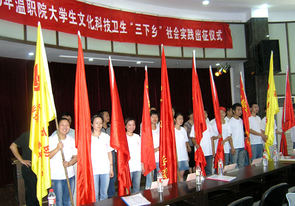 7月10日,温州职业技术学院2005年大学生暑期社会实践队在该院行政楼多功能厅举行了出征仪式。由此,2005年温州职业技术学院暑期社会实践活动正式拉开序幕。