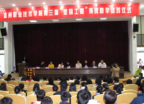 “金瓯工程”是鹿城区妇联、鹿城区女企业家协会和温职院人文系为解决贫困学生学习,生活问题,以结对为方式的扶贫助学组织。在“金瓯工程”成立之初,只有鹿城区女企业家参与,现在我院人文系许多老师纷纷参与其中,用爱心资助贫困大学生,让学生深受感动。“金瓯工程”的组成开展,为贫困大学生开辟了又一条绿色通道,有效地解决了一部分贫困生的实际困难,使贫困学生能够顺利完成高等教育,也为社会减轻了压力。