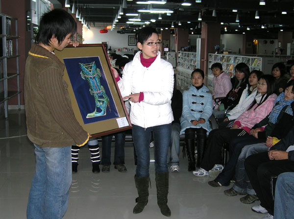 签约仪式之后,我院轻工学院李贞老师还在市图书馆的“特色馆”(前身为中国鞋都图书馆和温州服装图书馆)开展了开放式教学活动的“第一课”,我院鞋样设计专业同学认真聆听了专业老师对“概念鞋”设计的分析。课后,前来听课的同学还可以在“特色馆”里随意翻阅相关专业书籍,消化课堂上的知识。除此之外,同学们还可以与前来查阅资料的社会专业人士和读者进行探讨和交流,了解到社会信息和扩大交际圈。据悉,‘特色馆’里有许多国内外顶级、优秀、珍贵的原版鞋业、服装专业图书资料,具有极大的学生、查阅和参考价值,这可以大大扩展我院学生的视野,满足学生们求知的欲望和需求,使学生能时刻抓住流行的脚步,永远站在时尚的最前沿。