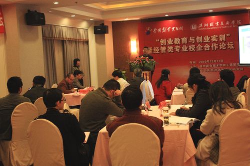 12月11日,由温州职业技术学院工商管理系、南京商友资讯商务电子化研究院、中国创业实习网联合主办的“创业教育与创业实训暨经管类专业校企合作论坛”在温州举行,来自温州大学、温州大学城市学院、温州职业技术学院、浙江工贸职业技术学院、温州科技职业学院、浙江东方职业技术学院、温州广播电视大学等7所在温高校的经管专业负责人齐聚一堂,对经管专业的实践教学进行了深入的探讨和交流。我院副院长夏晓军教授出席论坛并致辞,工商管理系副主任何海怀副教授主持本次论坛。