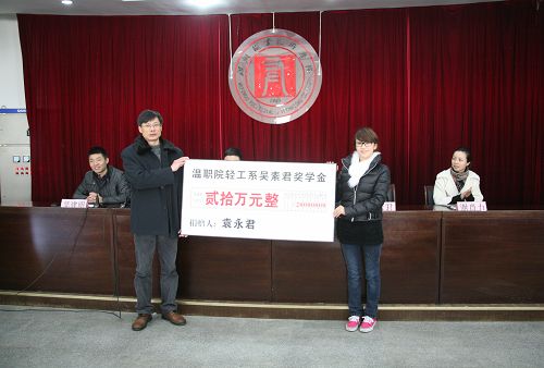 12月31日,我院2004届毕业生袁永君回到母校,以他爱人、院2004届毕业生吴素君的名义成立了“吴素君奖学金”,用以奖励勤奋学习、品学兼优的贫困大学生,给寒冬里的“寒门学子”们带来了温暖。首期奖学金为20万。