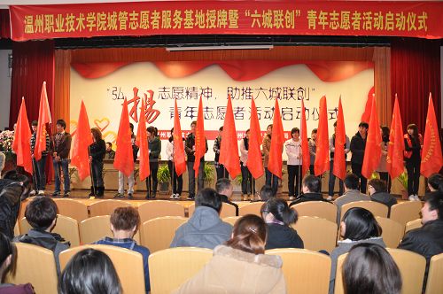 在全市人民纷纷热情投身“六城联创”活动之际,我院青年志愿者积极行动,发出了开展“洁化温州城•闪亮青春行”志愿行动的倡议,得到了温州市城管与执法局的大力支持和全院广大共青团员的热烈响应。3月16日下午,温州职业技术学院城管志愿者服务基地授牌暨“六城联创”青年志愿者活动启动仪式在信息楼报告厅隆重举行。温州市城管与执法局副局长王文一、机关党委副书记杨益锁、团委书记梁佳,学院夏晓军副院长、团委书记蔡后界、工商管理系党总支书记李建中同志参加了启动仪式。活动由院团委副书记吴冰主持。