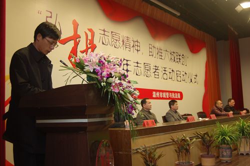 启动仪式上,温州市城管与执法局团委书记梁佳简要介绍了温州市城管志愿者总队成立以来开展志愿服务的活动情况。夏晓军副院长在致辞中勉励广大青年志愿者要发扬“奉献、友爱、互助、进步”的志愿精神,为将温州建设成富饶秀丽、和谐安康、宜居乐业的生态型现代化大都市贡献自己的力量。仪式上双方签署了志愿服务基地共建协议,并举行了温州市城管志愿者服务基地授牌。志愿者代表叶郁郁、张凤同学分别宣读了“六城联创”青年志愿者服务的活动方案和倡议书。参加仪式的领导同志还分别为3支“六城联创”志愿服务队及13支院系两级志愿服务总队、分队授旗。