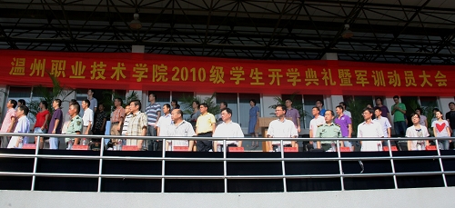 教师代表公共教学部李洁老师,老生代表电气电子工程系诸葛盛同学,新生代表人文传播系张佳同学等先后作了发言。温州军分区政治部副主任马跃光上校在会上就军训有关事宜作了动员。