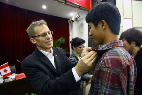 两校领导还一同为2010级中加班新生佩戴了BCIT校徽并合影留念。