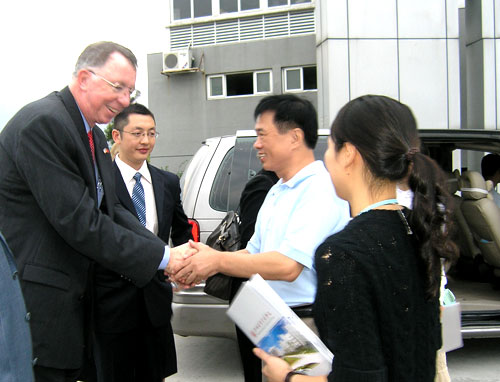 美国纽约库克大学校长乔瑟夫•博克博士与我院党委副书记倪集崇亲切握手