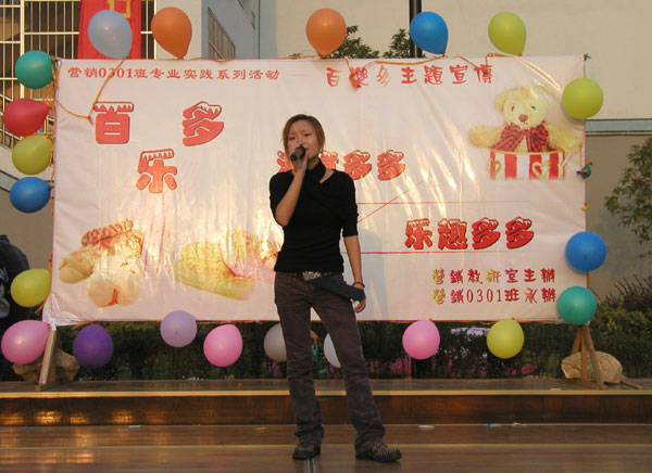 10月29日下午,学生公寓楼前一角人头攒动,在营销教研室的牵头下,营销0301班率先把课堂搬到了教室外。一堂营销0301班营销品牌宣传课在同学的自编自导下拉开了序幕。他们这次宣传的品牌是在同学们心目中并不熟悉的“百乐多”面包。营销专业同学在活动之前已经通过海报、横幅、宣传单、征文比赛等手段宣传了品牌,取得了一定的效果,一时之间“百乐多——满意多多、乐趣多多”的品牌被很多同学所熟知。这场户外品牌主题宣传作为系列品牌宣传一个内容由此应运而生,以使“百乐多”品牌在校园中更加深入人心。
