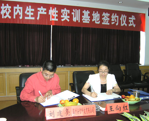 温州安信科技有限公司总经理刘建亮、温州名欧衬衫有限公司总经理童优慧以及学院教务处、电气系、轻工系的领导及部分教师代表参加了签约仪式。王向红副院长出席了仪式并作重要讲话。王副院长在讲话中首先对社会企业参与到高职教育改革并与我院共建校内生产性实训基地表示热忱欢迎,在介绍了学院创建示范性高职院校的情况后,她阐述了校企共建生产性实训基地的重要意义,并希望把该两个校企业合作基地都能建设成为温州市乃至全省的示范基地。