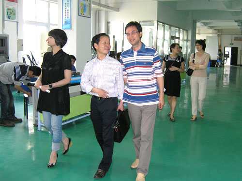 5月5日,温州市教育局高教处处长应元涨来我院调研,丁金昌院长陪同视察了我院独具特色的生产性实训基地。