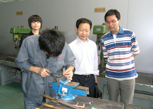 在调研中,应处长在各实训基地讲解员的介绍下依次参观了我院建工系、轻工系和机械系实训基地。对我院提出的“三个合一”实训基地建设理念,调研组非常感兴趣,频频赞赏。在我院机械系实训基地,应处长还随机询问了几位正在进行钳工实训的大一学生,了解我院学生的专业实训及学习情况。