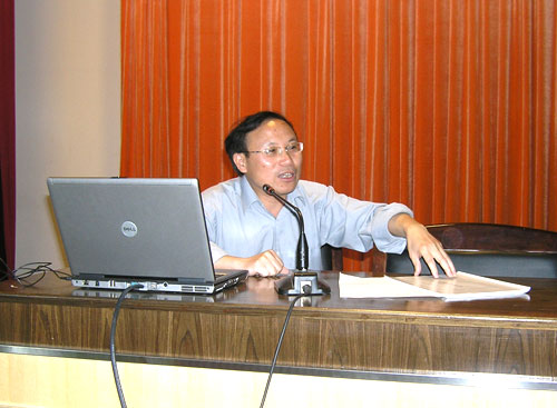 彭小明教授是2004年度中央教育科学研究所国内高级访问学者,浙师大中学语文研究中心研究员、硕导,多年从事教学研究工作,有丰富的理论和实践经验。他指出,说课的目标是为了教师专业的发展,为了上好课。说课也综合考评教师的学科专业知识、教材分析能力、教学设计能力、语言表达能力、对教育理论的实际应用能力等的有效手段。彭教授在讲座中还着重介绍了说课活动的要求,强调教师要在较短的时间内讲清“教什么”、“怎么教”,以及“为什么这样教”等教学问题,展现教师的思维过程,显示教师对教材的理解程度,驾驭教材和课堂的水平,以及运用教育教学理论的能力。彭教授近两个小时的精彩讲解深入浅出、幽默诙谐,让教师们受益匪浅。