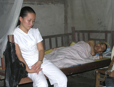 万双不在家,她的父亲金献新吃力地告诉记者,孩子暑期到村里的一家工艺厂打工去了。他让人捎口信把金万双叫了回来。由于长期营养不良,万双显得比同龄人要矮小和瘦弱得多,十个手指上还分别缠绕着一圈胶布,“上班时磨破了手指,这样粘着就不痛些。”她感觉这很平常。在村工艺厂,万双从早上一直做到晚上十点多,一天下来能拿二十来块钱。除了有好心人时不时地帮助她一点,暑期到村工艺厂打工成了金万双缓解经济压力的最好办法。这工一打就是四年。