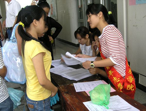 9月10日,迎新的第一天,虽然天空不作美,但雨水并不能浇灭全校师生迎新的热情。我院在各汽车站、火车站,设立专门接待站,由专车接送远道而来的新生及其家长。在校内,各系一字排开,从校门口一直到生活区一路设立咨询台、服务站等。许多新生班主任旁边坐着学生助理班主任,这些助理班主任都是由各大二、大三学生干部担任,及时为新生班主任介绍校园情况以及注意事项。每个窗口认真为新生们办理了注册、缴费、迁户等手续。