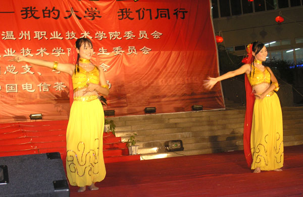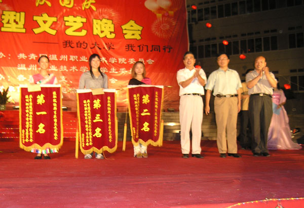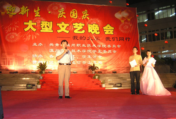 9月27日晚,2004年温州职业技术学院“迎新生·庆国庆”大型文艺晚会在图书信息大楼广场前隆重举行。为入学新生举办专场文艺晚会是我院由来已久的优良传统。本次迎新晚会由我院团委、学生会主办,赞助单位是温州电信茶山支局。