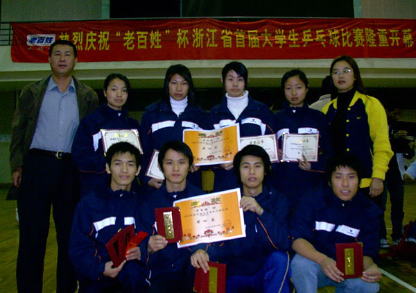 2004年浙江省大学生“老百姓”杯乒乓球比赛日前在浙江大学体育系(西溪校区)落下帷幕。我院派出了四名男选手和四名女选手各参加了乙组男女团体和男女单打共四个项目的角逐。在团体比赛中,经过捉对厮杀,我院男女团体均进入前四名。在男子单打比赛中,代表我院出战的马亮和机械系陈国柱在比赛中作风顽强,击败各路高手,分别夺得男子单打亚军和季军。