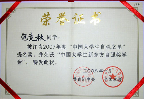 由共青团中央、全国学联主办的2007年度“中国大学生自强之星”评选活动近日揭晓,我院人文系05级学生包竞秋获得“中国大学生自强之星”提名奖,并且荣获“中国大学生新东方自强奖学金”。