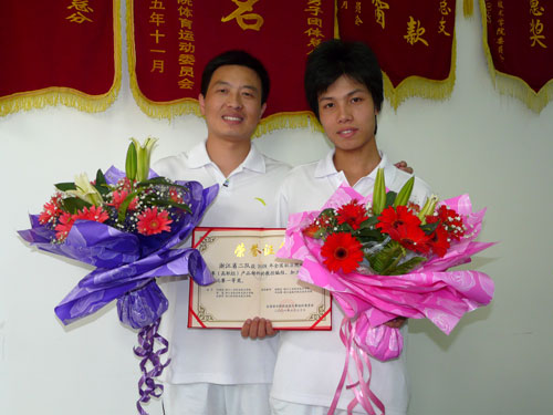 全国技能比赛第一名获得者张亮(图右)与指导老师何庆稀合影
