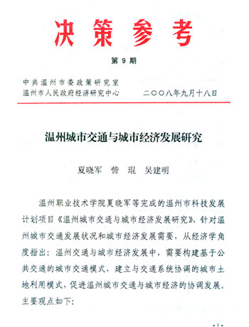 我院夏晓军副院长主持完成的温州市科技计划项目《温州城市交通与城市经济发展研究》(R20060052),因为研究视角的创新性与对策的可行性,被中共温州市委政策研究室和温州市人民政府经济研究中心主办的《决策参考》第9期收录。