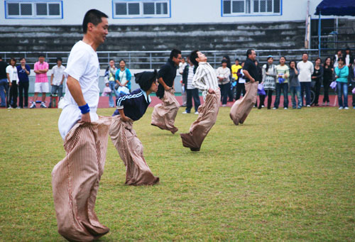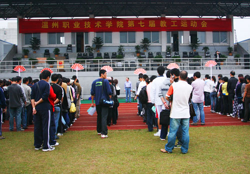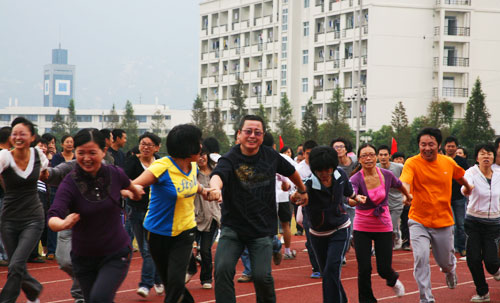 在定点投篮比赛场上,一些女教师还不时地向男教师们讨教起经验,氛围相当融洽。即使是竞技项目,教师们还是一脸的轻松,没有剑拔弩张,有的只是欢声笑语,同事之间亲密无间,相互鼓劲,相互切磋技艺。在有意思的滚雪球比赛中,尽管每个人跑得是气喘吁吁,但大家还是手拉手,相互鼓劲。每当一个小组完成了比赛,周围顿时响起一片掌声和喝彩声。教工校运会上演奏了一曲和谐欢乐的歌。