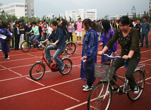 本次教工运动会按年龄分为甲组和乙组,设有20米袋鼠跳、自行车慢骑、定点投篮、单人跳绳、100米、跳远、铅球等,既有传统体育竞技项目,又有娱乐项目,在比赛场上有加油声,也不时地传出阵阵笑声。