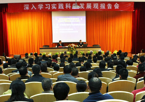 报告会上,郭教授从实证分析的角度阐释了科学发展观的理论地位和指导意义,指出科学发展观是对当代世界发展新趋势的综合反映,是对我国发展实践的深刻总结,是对毛泽东思想、邓小平理论和“三个代表”重要思想的丰富和发展,是马克思主义中国化的最新理论成果。郭教授立足科学发展观的科学内涵、精神实质和理论体系三个方面,深刻剖析了科学发展观的主要观点,提出全面把握科学发展观的基本思想,是深入学习实践科学发展观的关键。面对存在的诸多现实问题,他指出,要解放思想,转变观念,克服制约科学发展的理念、体制、机制,切实按照科学发展观的要求,在全面推进中国特色社会主义建设实践中做到三点:一要进一步增强贯彻科学发展观的自觉性和坚定性,增强六大意识,即学习意识、使命意识、机遇意识、忧患意识、创新意识、大局意识;二要进一步创新发展实践活动,建立发展实践创新体系,即以观念创新为先导、以道路创新为前提、以产业创新为基础、以科技创新为重点、以素质创新为根本、以制度创新为保证;三要进一步探索科学发展的实践机制,实现模式特色化、主体本位化、决策持续化、运营规模化、方式集约化、形态一体化、战略国际化、体制合理化。