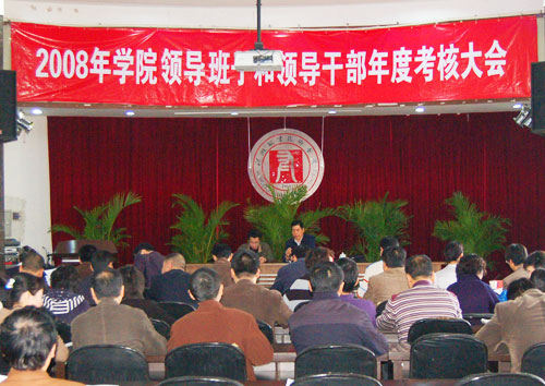 根据省委组织部、省教育工委、市委组织部的工作安排和要求,我院于4月10日在行政楼一楼多功能厅举行了学院领导班子和领导干部2008年度考核大会,接受上级考核组对我院领导班子和领导干部进行考核。参加考核大会的有省委组织部干部三处副处长叶志航,省教育工委干部处副处长林成格,市委组织部干部三处处长白炳兴, 市委组织部干部三处副处长王爱娥,省教育工委干部处华建伟;学院学院领导班子成员、中层干部、院级及以上科研院所负责人、具有正高职称教师、民主党派人士代表、本届教代会工代会主席团成员、离退休老领导代表参加了会议,考核大会由学院党委书记陈光天主持。