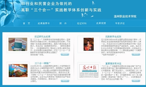 这次我院报送的教学成果经浙江省教育厅推荐、教育部初审公示、网评、会评等程序,最终被评为国家教学成果二等奖,其成果主要是通过对高职实践性教学与区域经济有效对接的研究与实践,以行业和民营企业为依托,与区域支柱产业和人文精神高度融合,从改变校园形态入手,将传统教室改建成为教学工厂,吸纳社会力量参与实践教学,把企业生产车间引入校园,从三个层面创建以“学做合一、校企合一、教研合一”为主要内涵的“三个合一”实践教学体系,体现了“校企合作、工学结合”的高职教育改革指导思想,由于教学理念先进,模式新颖,人才培养成效显著,已在其他同类高校中进行推广与应用。