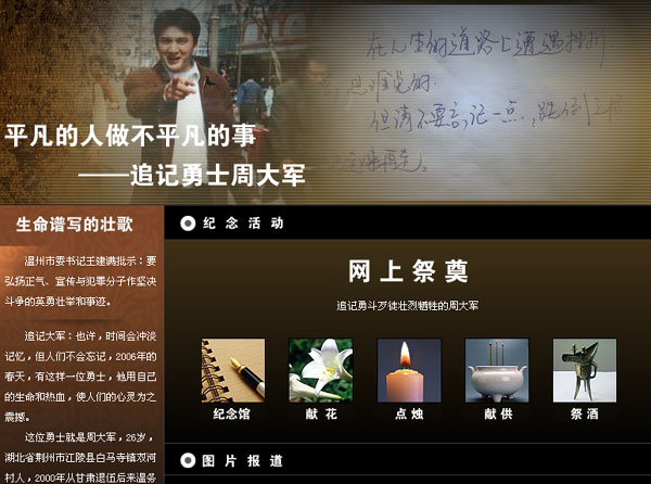 这样一段段感人肺腑的言语全部来自于“纪念周大军专题网站纪念馆”。在周大军用热血渲染瓯越大地后,我院校园里积极组织师生宣传学习周大军事迹。我院电子商务0401班陈善阳和信息0402班陈敏两位同学自发制作了纪念周大军专题网站(http://house.66wz.com/zt/zdj/showleave.asp),在校园里发起了网上祭奠英雄的活动。该专题网站还得到了温州新闻网的关注和支持。